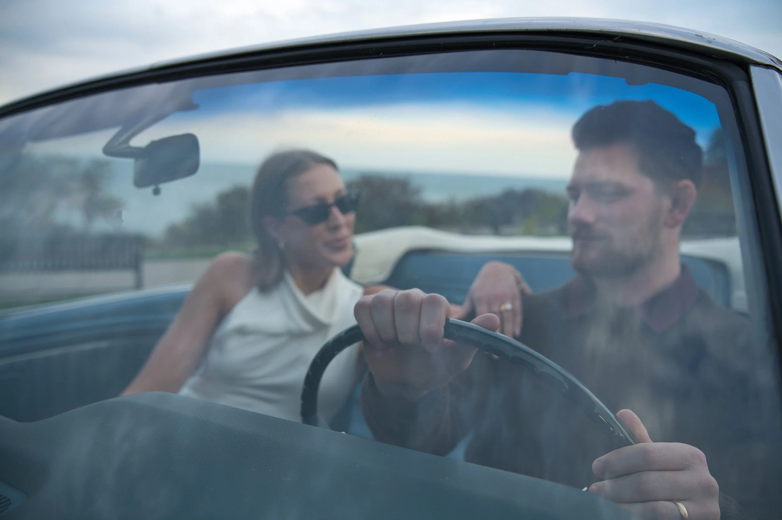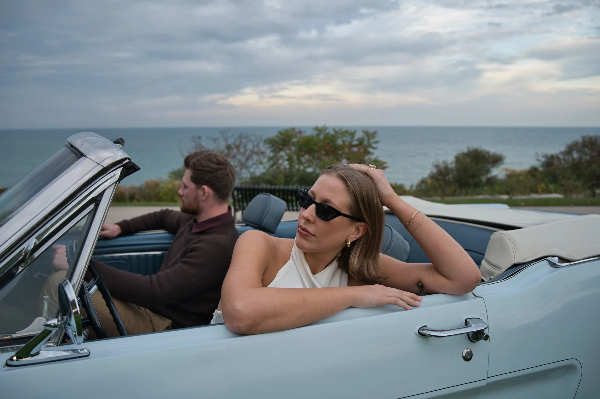 These two have been together since high school, so their connection felt effortless from the moment we started. We explored the cliffside together, laughing, reminiscing, and letting the vintage Mustang add a little nostalgic charm to the evening. The portraits were full of natural moments, quiet glances, and little in-between gestures that tell a story of the years spent together. As their session came to a close, the sun started to dip behind the water, casting pink and blue hues over the cliff. The car and view really felt perfectly timeless which is why I chose this vibe for them.